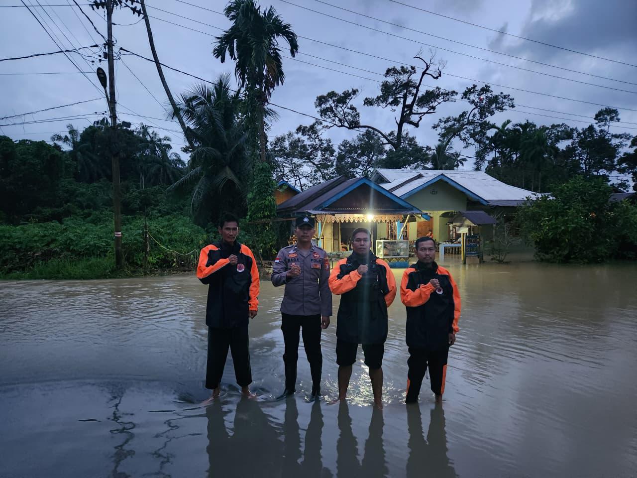 Tidak hanya menyampaikan imbauan, personel Polsek Daik Lingga juga turut membantu warga yang aktivitasnya sempat terganggu akibat genangan air.