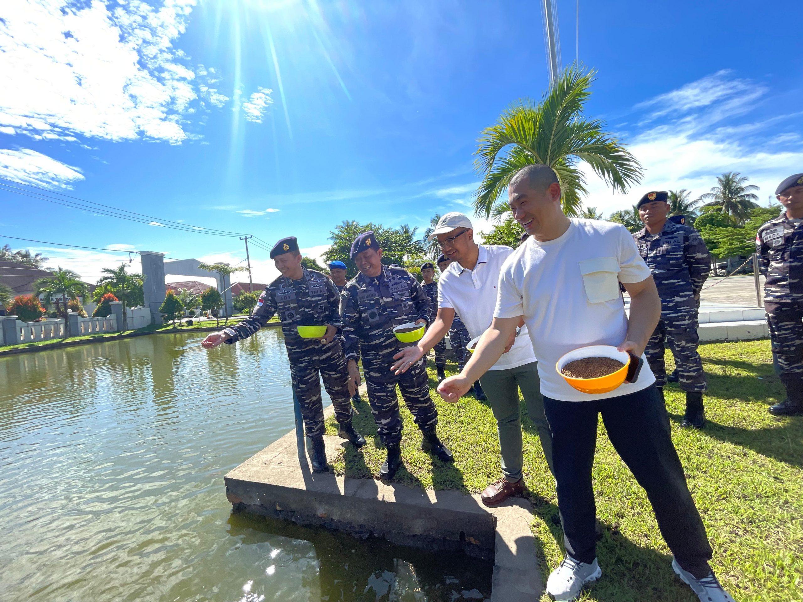 (Aster bersama Danlanal Ranai saat memberikan makan ikan Nila )